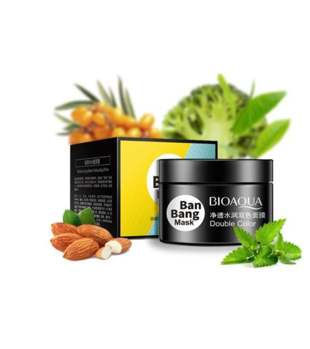 ماسک Ban Bang بیواکوا شامل دو قسمت میباشد قسمت سبز سبزیجات خنک کننده و آنتى اکسیدان شامل چاى سبز نعنا گل کلم و برگ ملیسا است که مخصوص قسمت تیزون صورت مى باشد و قسمت زرد رنگ آن حاوى مواد مغذى مانند روغن بادام آووکادو پاپایا و نوعى گیاهان وحشى میباشد و مخصوص بقیه صورت است و این ماسک به صورت ترکیبى استفاده میشود.